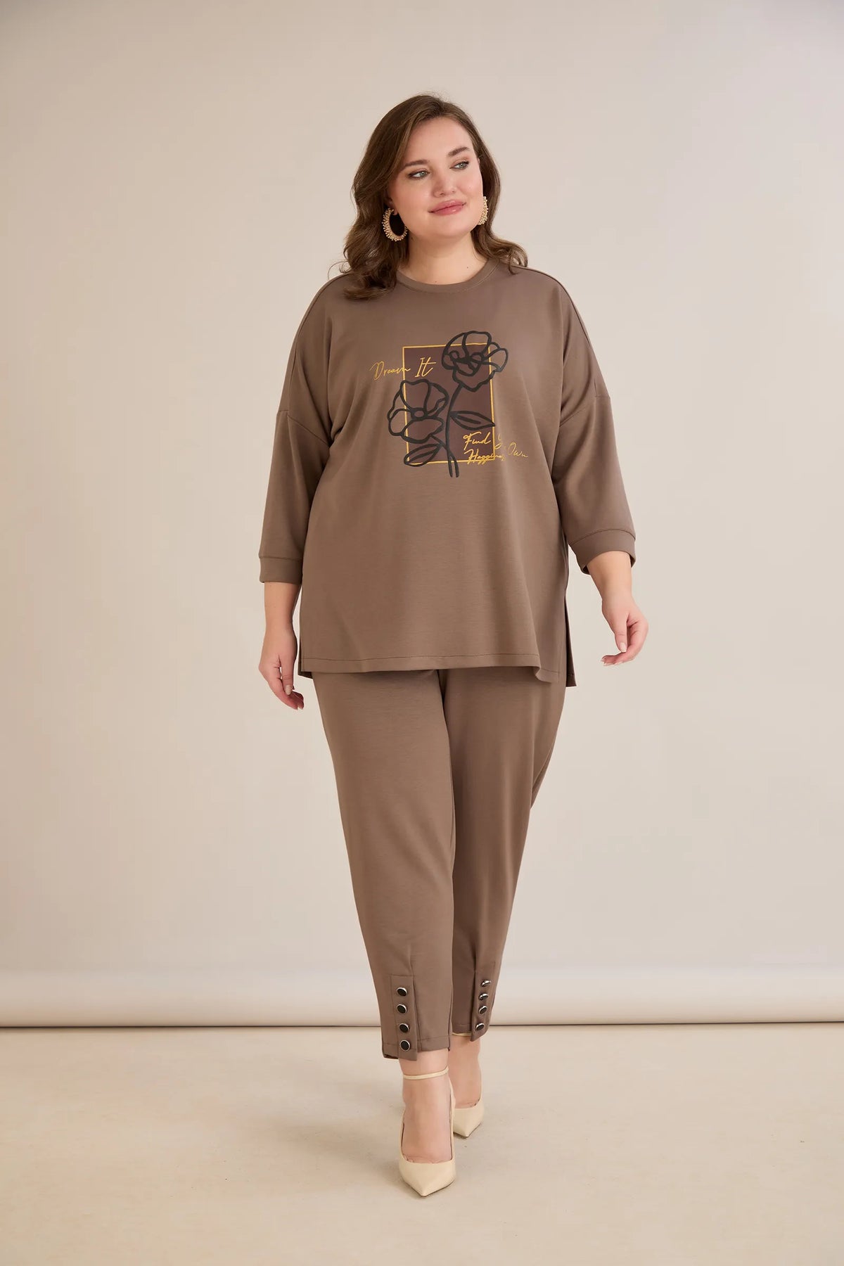 Pantaloni eleganți și extrem de comozi din material elastic care garantează confort absolut pe tot parcursul zilei. Modelul are nasturi rafinați, metalici la manșete, care vor fi detaliul tău stilat. Nasturii sunt funcționale și pot fi descheiați, permițându-vă să reglați lățimea pantalonului în funcție de aspectul dorit. Acești pantaloni sunt perfecți pentru femeia modernă care caută un echilibru între confort și elegantă.