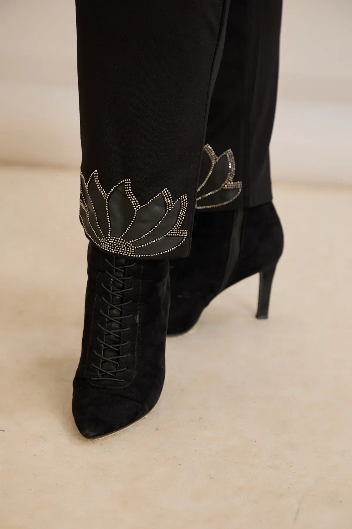 • Accente cu flori din piele pe cracii pantalonilor, decorate cu pietricele