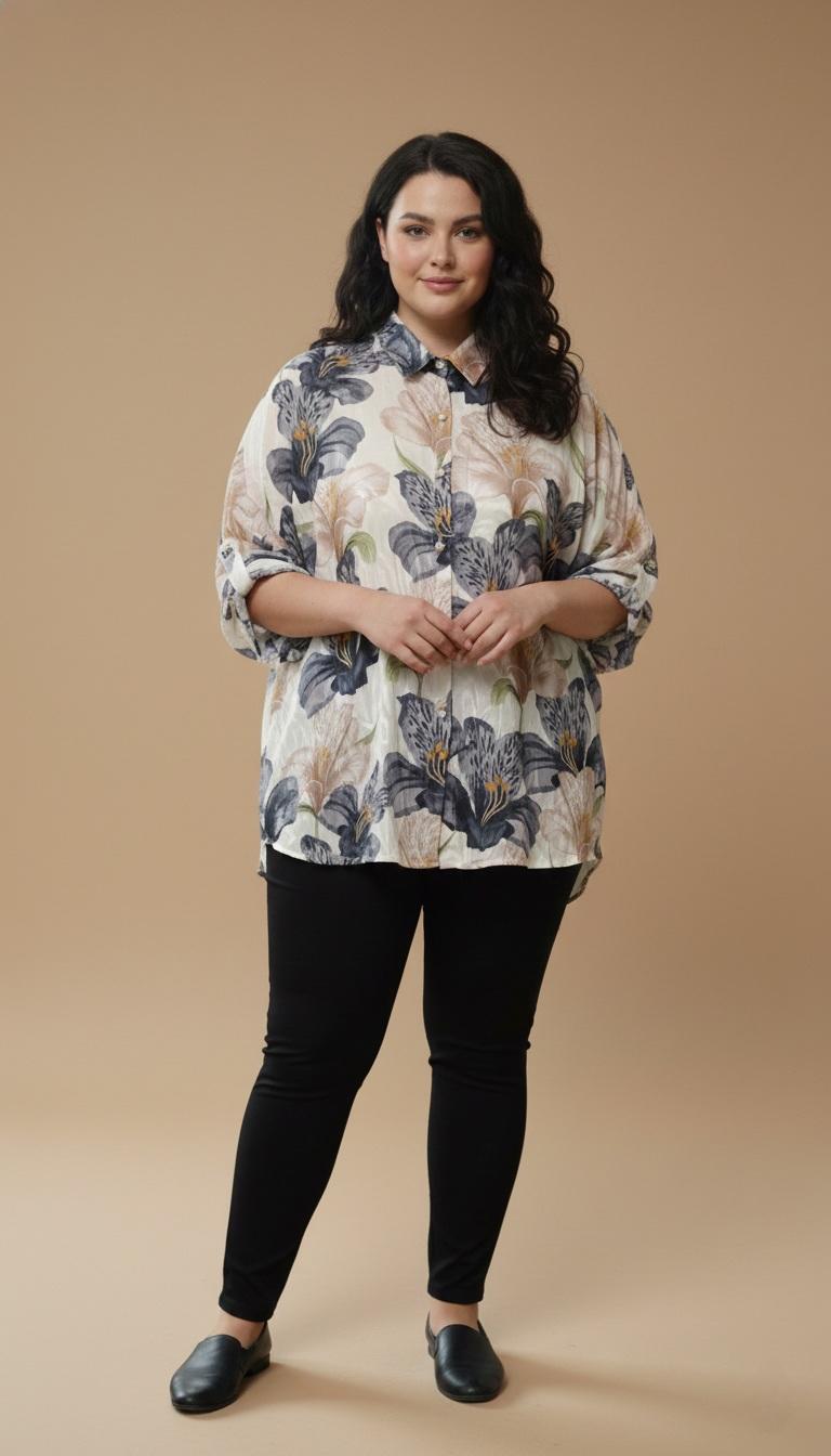 Cămașă elegantă mărime mare cu imprimeu floral – negru